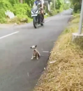 The sky over Bali split with thunder as rain slicked the asphalt, turning the highway into a blur of rushing wheels and blinding headlights. Amid that chaos, something small and fragile fought to hold on — a tiny puppy, nearly bald from mange, shivering so hard her body seemed ready to collapse. She stood frozen at the very edge of disaster, with death just inches away in the form of roaring cars and speeding motorbikes.