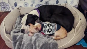 Now called Lady Gaga (or Gaga) and Karma, the two are settling into a quiet, loving household — exactly what they needed. They nap curled up against each other, play gently side by side, and are preparing to celebrate their very first holiday season with their new family.