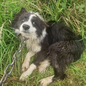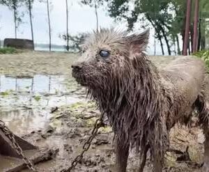 In the quiet shadows of an abandoned riverside, a heartbreaking scene unfolds—a small dog, blinded and covered in mud, chained to a rusting post. His fur is matted,…