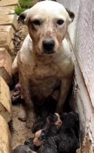Surrounding her feet, nestled in the mud, was an entire litter of puppies—just a few hours old. The tiny family, cold and wet, had no way of surviving on their own. The devoted mom, who had given birth in such harsh conditions, was desperately trying to protect her puppies from the elements.