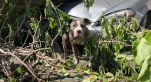 Following the cries, neighbors stumbled upon a heartbreaking sight: a dog, trembling in fear, stuck behind an abandoned house and tangled in the ruins of fallen trees. She was alone, crying out with everything she had left. Shocked, they immediately contacted Stray Rescue of St. Louis (SRSL), knowing only trained rescuers could help.