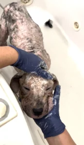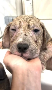 Despite her obvious suffering, Rosie never snapped, never growled, never resisted. Instead, she leaned into every gentle touch, as if she somehow knew these people were different. Soon, a vet diagnosed her with demodex mange, a condition caused by mites that left her skin raw and defenseless.