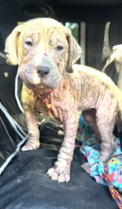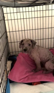 When rescuers from Beagles and Bentleys walked into a shelter in May 2023, their eyes fell on a sight they would never forget. Huddled in the corner of her kennel was a tiny, hairless puppy. At just 3 months old, she looked far older — her pink, wrinkled skin cracked open with every move, raw and inflamed from neglect.