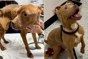 She couldn’t walk; rescuers had to carry her from the transport vehicle. And yet, in a moment that stunned everyone, she wagged her tail and leaned forward to give kisses.