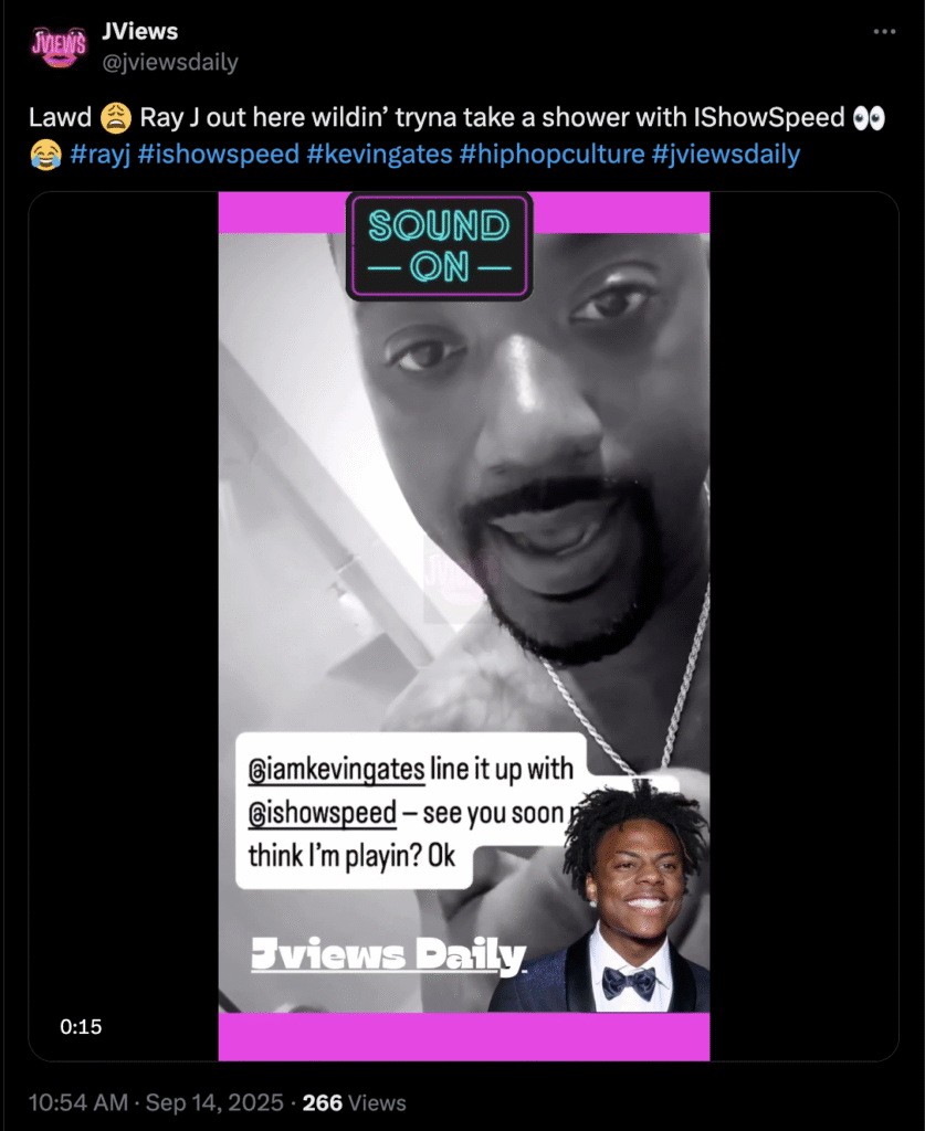 In a clip shared by JViews on X, Ray J, fresh from a steamy bathroom, drops a bombshell. “My next person I want to take a shower with is iShowspeed,” he declares confidently. Referencing IShowSpeed’s recent stream with rapper Kevin Gates—whom Ray J calls “my brother”—he adds, “I heard you about the stream with Kevin Gates… I’m gonna have that n***a line it up, bro. I’ll see you soon, iShowspeed.” The audacious invite has social media in a frenzy, with fans debating if it’s a genuine collab pitch or just Ray J chasing clout. IShowSpeed hasn’t responded yet, but his high-energy fanbase is ready for a potential reaction stream that could break the internet.