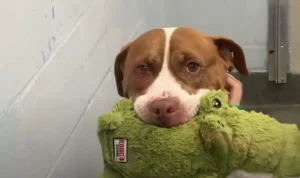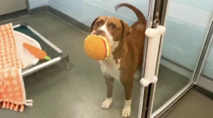 Soon after her arrival, the staff discovered Peanut’s greatest joy: stuffed toys. The moment she was given a “stuffie,” Peanut would cling to it for hours, carrying it everywhere she went. In the sometimes stressful shelter environment, her stuffies became her greatest source of comfort.