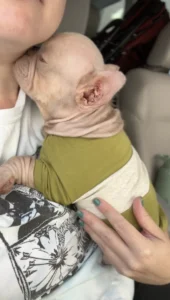 The road ahead wasn’t easy. Harold’s skin needed constant treatment, and protective sweaters became his second skin, keeping him warm while his body healed. Volunteers lovingly called him “the little pink pup,” swaddled as if he were a baby in their arms.