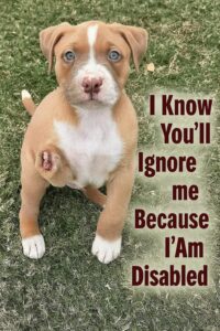 Overlaid text reads, “I Know You’ll Ignore Me Because I Am Disabled,” a stark reminder of the challenges faced by animals with special needs. The pup’s expressive gaze tells a story of resilience, despite its physical limitation.