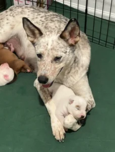 Instead of fear, the mama dog greeted Luna with pleading eyes, as if begging, “Please… save my babies.” Without hesitation, she climbed into the kennel, placing all her trust in a stranger, while Luna carefully wrapped each trembling pup in a towel. For the first time, the little family was safe.