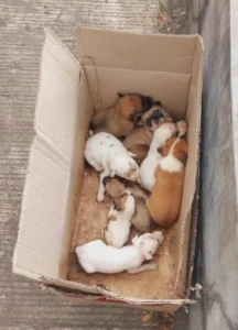 Inside the box were nine tiny puppies, huddled together, abandoned and crying for help. Without a second thought, the cyclists rushed to get assistance, quickly contacting Pawssion Project, a local rescue group known for never turning away from an animal in need.